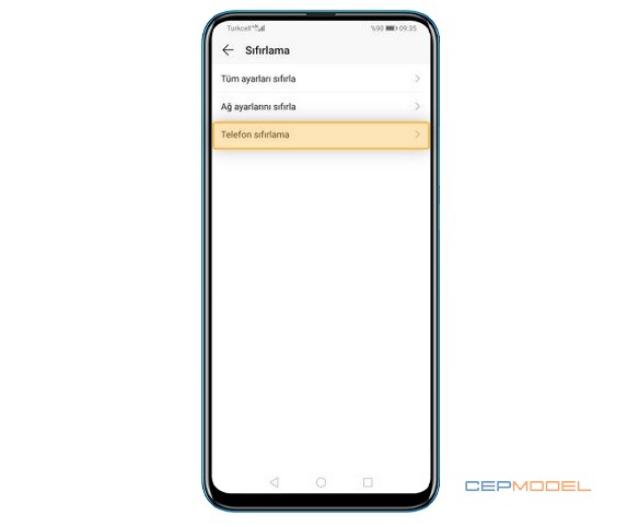 Sıfırlama menüsü içerisinde ağ ayarlarını sıfırla, tüm ayarları sıfırla ve Telefon sıfırlama var bizim Telefon sıfırlama seçeneğine tıklamamız gerekli.